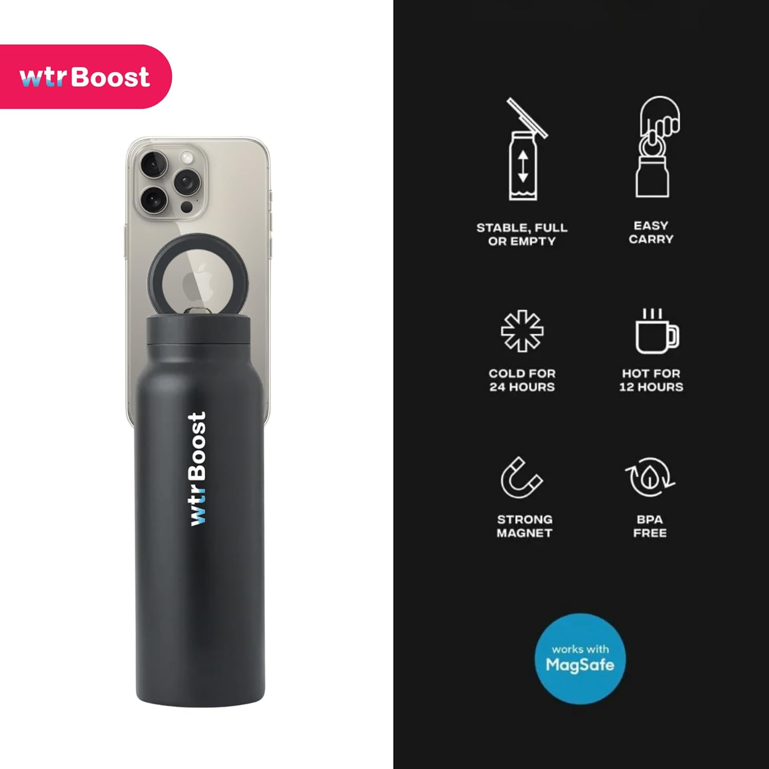 WTR Boost Black Insulated Stainless Steel Water Bottle with Mobile Holder, Flask for Hot or Cold Beverages - 500ml