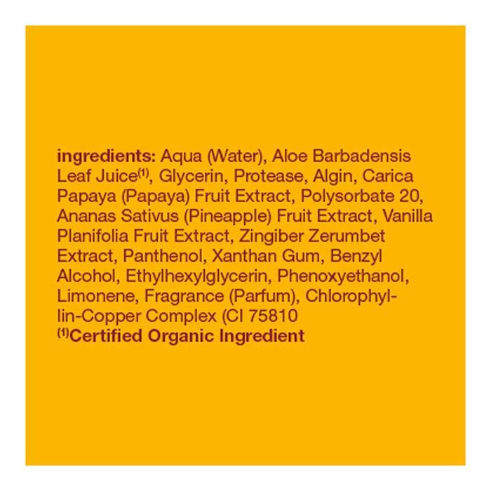 Aqua (Water), Aloe Barbadensis Leaf Juice(1), Glycerin, Protease, Algin, Carica Papaya (Papaya) Fruit Extract, Polysorbate 20, Ananas Sativus (Pineapple) Fruit Extract, Vanilla Planifolia Fruit Extract, Zingiber Zerumbet Extract, Panthenol, Xanthan Gum, Benzyl Alcohol, Ethylhexylglycerin, Phenoxyethanol, Limonene, Fragrance (Parfum), Chlorophyllin-Copper Complex (CI 75810). (1)Certified Organic Ingredient