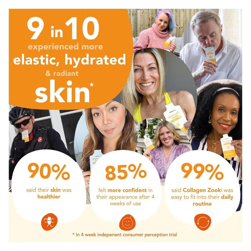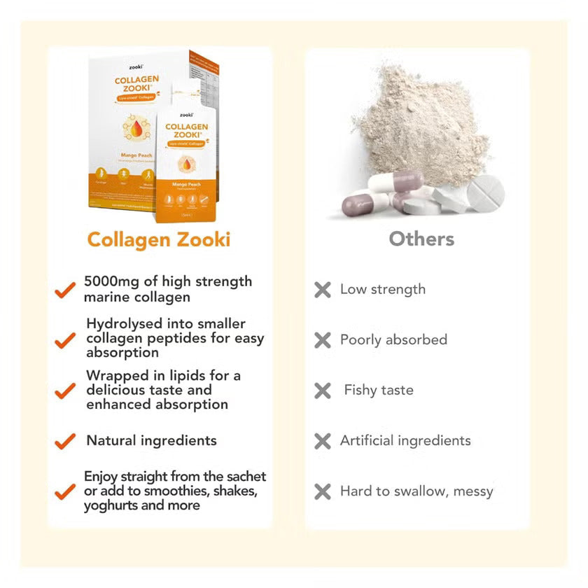 Zooki Marine Collagen 5000mg Mango Peach Flavor is a premium liquid supplement designed to deliver clinically effective collagen support in a delicious, travel-friendly sachet. Each serving contains 5g of hydrolysed marine collagen peptides wrapped in Zooki’s proprietary Lipo-Shield™ lipid emulsion, enhancing absorption and bioavailability. Enriched with 30mg of Vitamin C, it promotes natural collagen formation, improves skin hydration, and supports joint flexibility, nail strength, and hair vitality. The sugar-free formula is made with 100% natural ingredients, including real mango juice concentrate and natural citrus extracts, making it ideal for daily beauty routines, active lifestyles, and age-conscious wellness seekers.