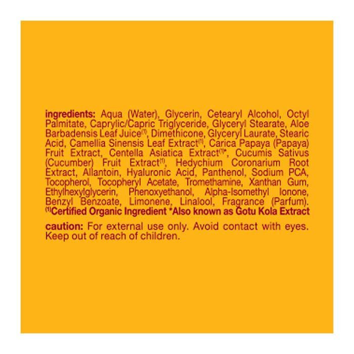Aqua (Water), Glycerin, Cetearyl Alcohol, Octyl Palmitate, Caprylic/Capric Triglyceride, Glyceryl Stearate, Aloe Barbadensis Leaf Juice(1), Dimethicone, Glyceryl Laurate, Stearic Acid, Camellia Sinensis Leaf Extract(1), Carica Papaya (Papaya) Fruit Extract, Centella Asiatica Extract(1)*, Cucumis Sativus (Cucumber) Fruit Extract(1), Hedychium Coronarium Root Extract, Allantoin, Hyaluronic Acid, Panthenol, Sodium PCA, Tocopherol, Tocopheryl Acetate, Tromethamine, Xanthan Gum, Ethylhexylglycerin, Phenoxyethanol, Alpha-Isomethyl Ionone, Benzyl Benzoate, Limonene, Linalool, Fragrance (Parfum). *Also known as Gotu Kola Extract