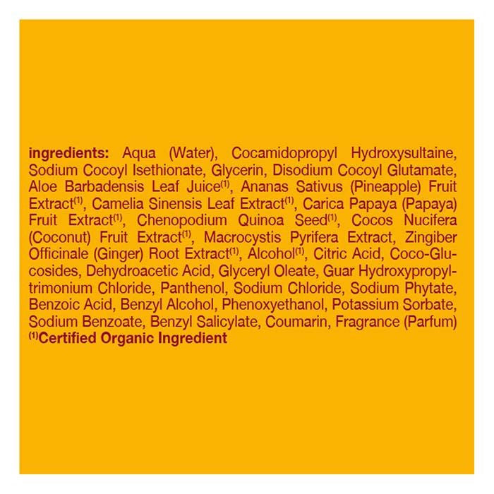 Aqua (Water), Cocamidopropyl Hydroxysultaine, Sodium Cocoyl Isethionate, Glycerin, Disodium Cocoyl Glutamate, Aloe Barbadensis Leaf Juice(1), Ananas Sativus (Pineapple) Fruit Extract(1), Camelia Sinensis Leaf Extract(1), Carica Papaya (Papaya) Fruit Extract(1), Chenopodium Quinoa Seed(1), Cocos Nucifera (Coconut) Fruit Extract(1), Macrocystis Pyrifera Extract, Zingiber Officinale (Ginger) Root Extract(1), Alcohol(1), Citric Acid, Coco-Glucosides, Dehydroacetic Acid, Glyceryl Oleate, Guar Hydroxypropyltrimonium Chloride, Panthenol, Sodium Chloride, Sodium Phytate, Benzoic Acid, Benzyl Alcohol, Phenoxyethanol, Potassium Sorbate, Sodium Benzoate, Benzyl Salicylate, Coumarin, Fragrance (Parfum) (1)Certified Organic Ingredient