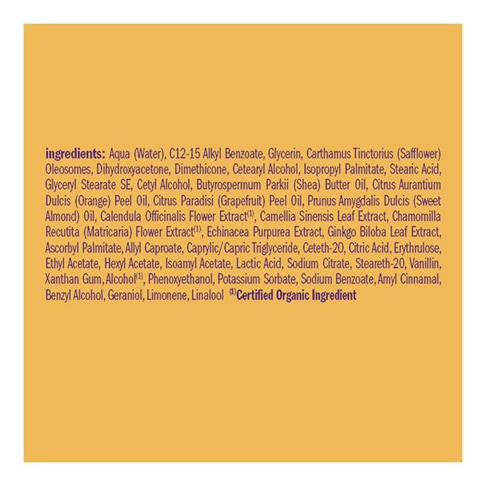 Aqua (Water), C12-15 Alkyl Benzoate, Glycerin, Carthamus Tinctorius (Safflower) Oleosomes, Dihydroxyacetone, Dimethicone, Cetearyl Alcohol, Isopropyl Palmitate, Stearic Acid, Glyceryl Stearate SE, Cetyl Alcohol, Butyrospermum Parkii (Shea) Butter Oil, Citrus Aurantium Dulcis (Orange) Peel Oil, Citrus Paradisi (Grapefruit) Peel Oil, Prunus Amygdalus Dulcis (Sweet Almond) Oil, Calendula Officinalis Flower Extract(1), Camellia Sinensis Leaf Extract, Chamomilla Recutita (Matricaria) Flower Extract(1), Echinacea Purpurea Extract, Ginkgo Biloba Leaf Extract, Ascorbyl Palmitate, Allyl Caproate, Caprylic/Capric Triglyceride, Ceteth-20, Citric Acid, Erythrulose, Ethyl Acetate, Hexyl Acetate, Isoamyl Acetate, Lactic Acid, Sodium Citrate, Steareth-20, Vanillin, Xanthan Gum, Alcohol(1), Phenoxyethanol, Potassium Sorbate, Sodium Benzoate, Amyl Cinnamal, Benzyl Alcohol, Geraniol, Limonene, Linalool, Certified Organic Ingredient