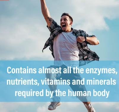 - Contains almost all the enzymes, nutrients, vitamins and minerals required by the human body