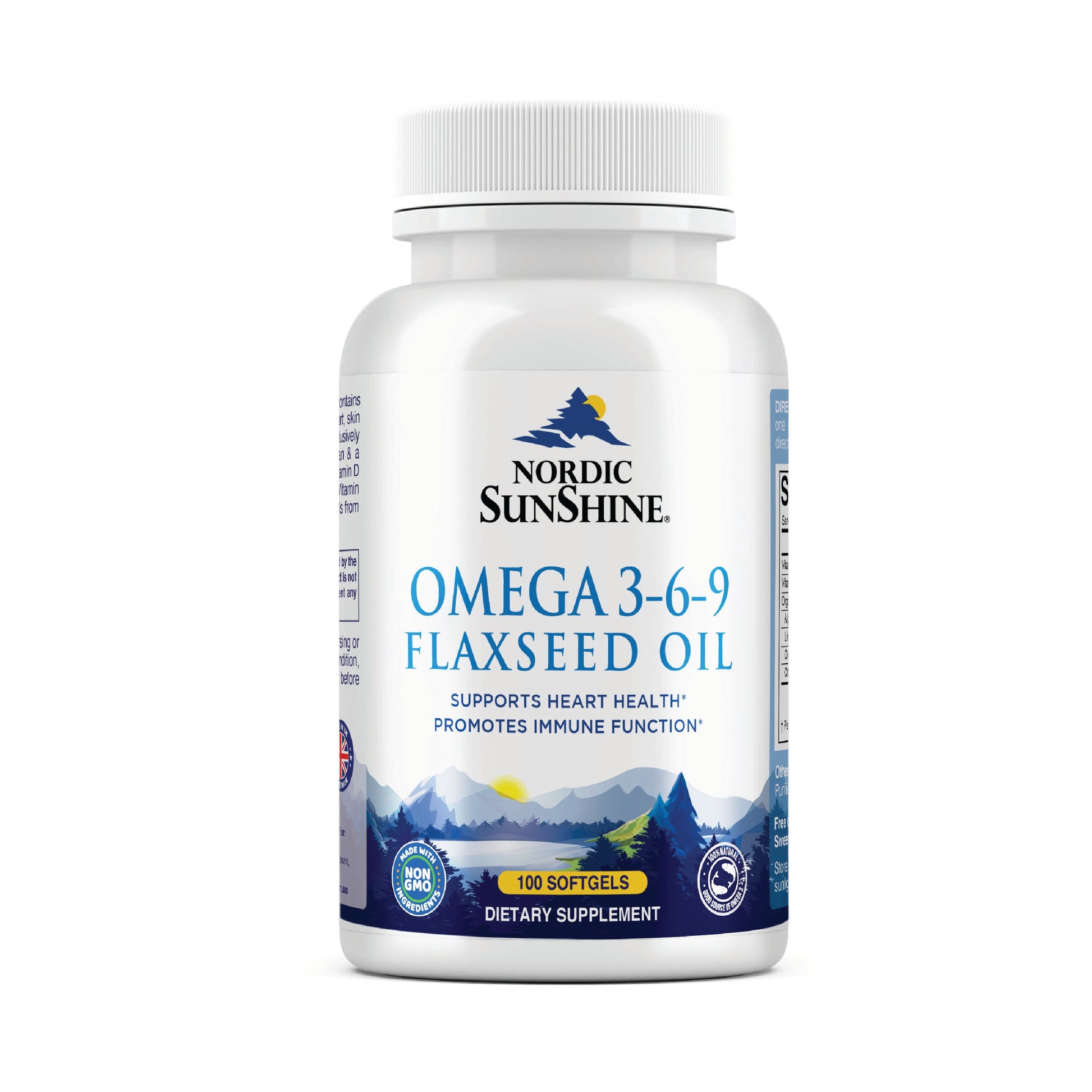 Nordic Sunshine Omega 3-6-9 Flaxseed Oil 1000mg, ALA-Rich Plant-Based Formula with Vitamin D & E for Heart, Brain -100 Softgels