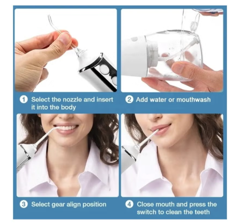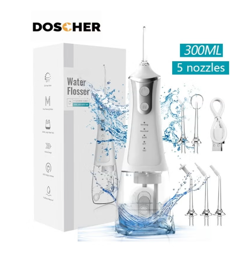 This portable water dental flosser offers effective teeth cleaning with four adjustable modes to suit different oral care needs. Equipped with five scalable jet nozzles, it ensures thorough cleaning between teeth and along the gumline. Its 300ml water tank provides extended use, while the IPX7 waterproof rating guarantees safe operation even in wet environments. Designed for convenience and efficiency, it promotes better oral hygiene through deep cleaning and gentle gum stimulation.