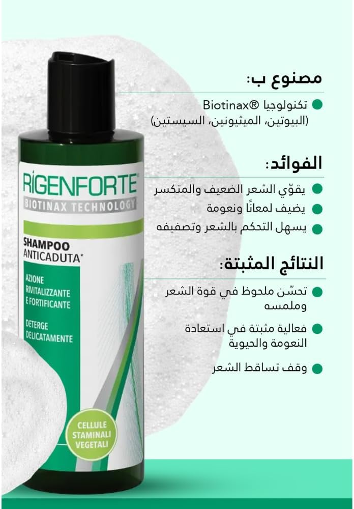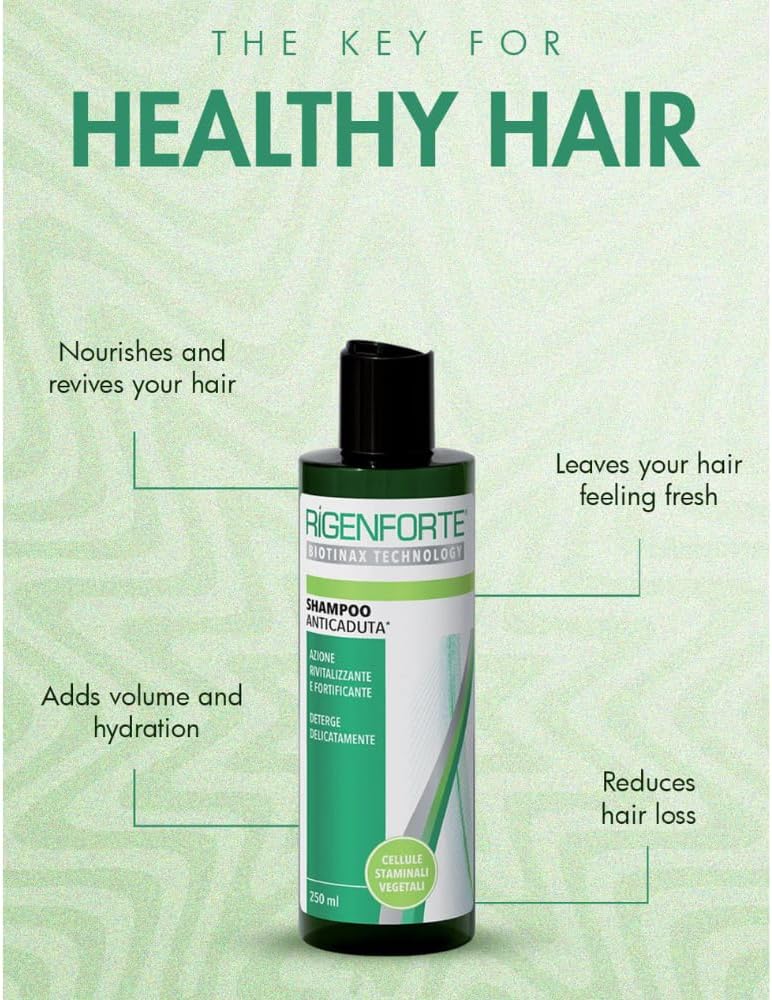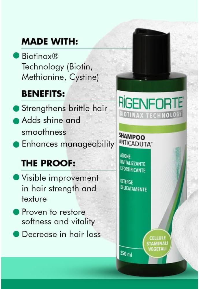Rigenforte Anti-Hair Loss Shampoo is a dermatologically-tested formula designed to gently cleanse the scalp while delivering targeted action against hair weakening and loss. Enriched with the patented Biotinax® Complex—a potent blend of Biotin, Methionine, and Cystine—this shampoo strengthens the hair shaft, improves scalp health, and creates the ideal environment for hair growth and follicle vitality.