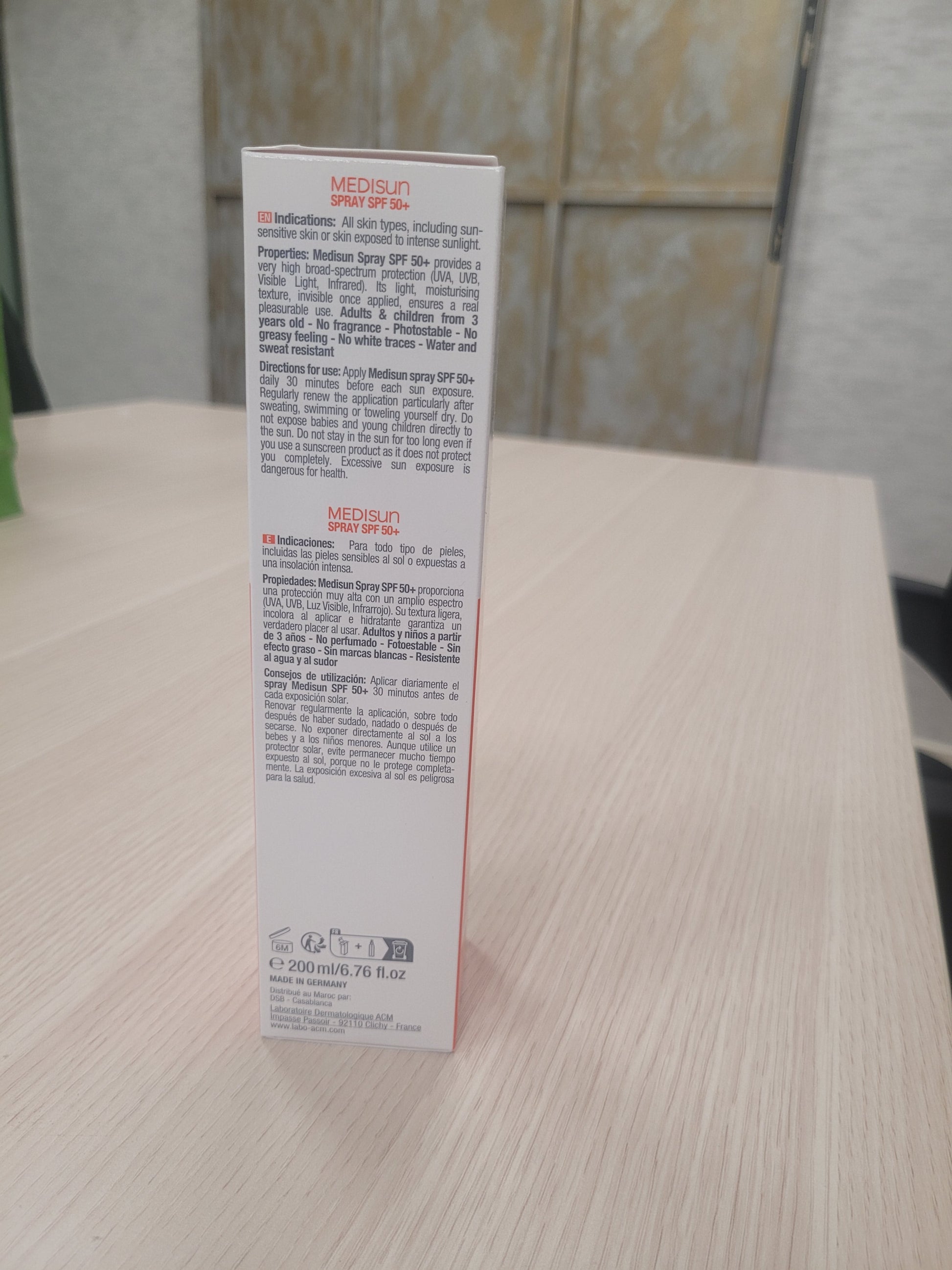 The continuous mist formula delivers a fine, even application that covers hard-to-reach areas like the back, ears, and behind the legs. Enriched with traditional UV filters and natural ingredients, it ensures optimal sun protection while maintaining a light, moisturizing texture. The spray is invisible once applied, offering a pleasant user experience for all skin types. Protect your skin from harmful sun exposure while allowing essential vitamin D production with ACM Medisun SPF50+.
