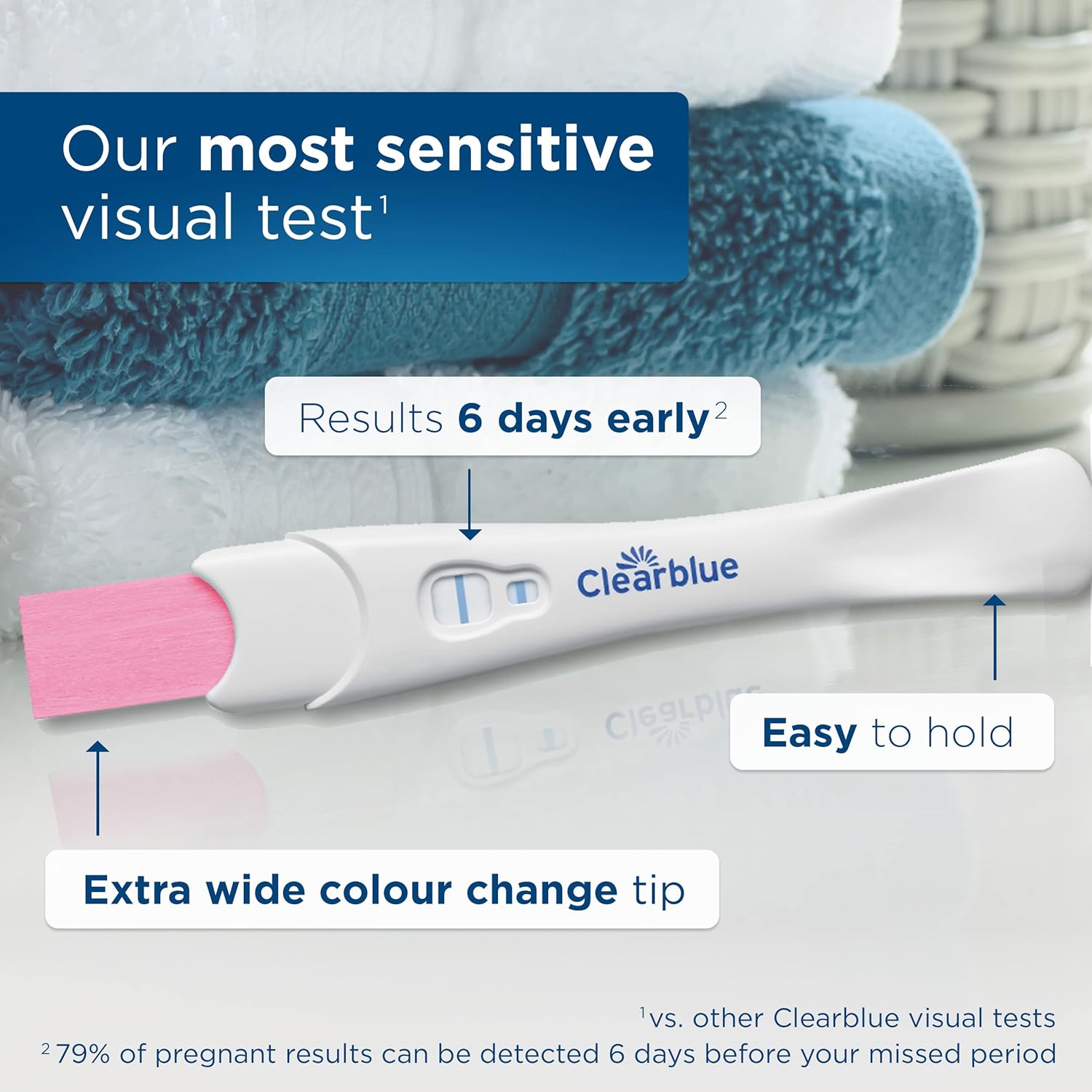 Clinically proven to detect 78% of pregnancies 6 days before the missed period, 93% at 5 days, and over 99% from 4 days before.